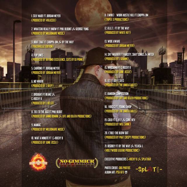 Splat 860, No Gimmick Music Coalition, and The Legal Dope Spot proudly bring to you Splat860’s highly anticipated album “Disobey The LP”. This project is packed with head nod shit that you will be sure to have on repeat for months to come. With features from the likes of Jordan Meyer, Phil Blount, George Yung, Young Gwop, C-Rocky B, By The Way and many more. Also including production from 4Klassix, Jordan Meyer, Millionaire Music, The Unbeatables, Hollywood Legend Productions, June Jissle, White Key, Triple X Productions, Life and Death Productions, Anno Domini,Beyond Excellence, Phat Crispy Productions, Will Shine, J Gramm & L Rello.